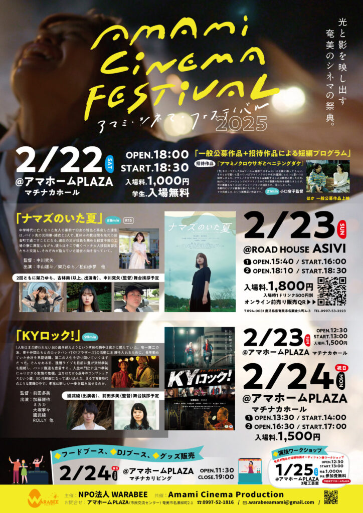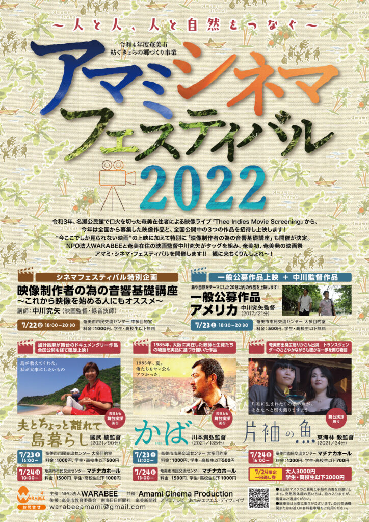 2022年7月より始まった「アマミ・シネマ・フェスティバル」。奄美市名瀬の市街地に位置するアマホームPLAZA(奄美市市民交流センター)を拠点とし、地域の人々や、そこから見渡せる海・山を背景に、「人と人、自然を繋ぐ」奄美大島独自の映画祭として開催しております。